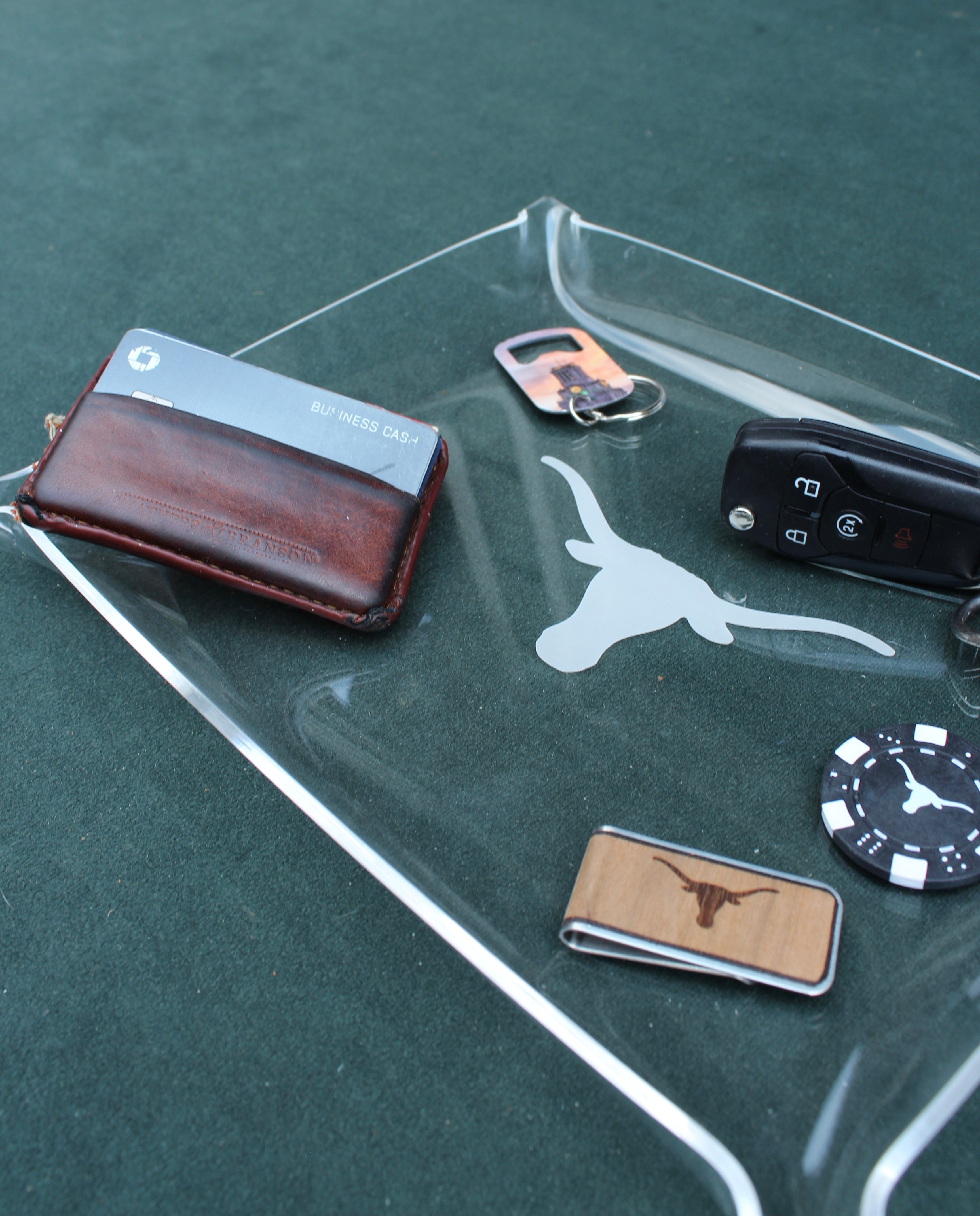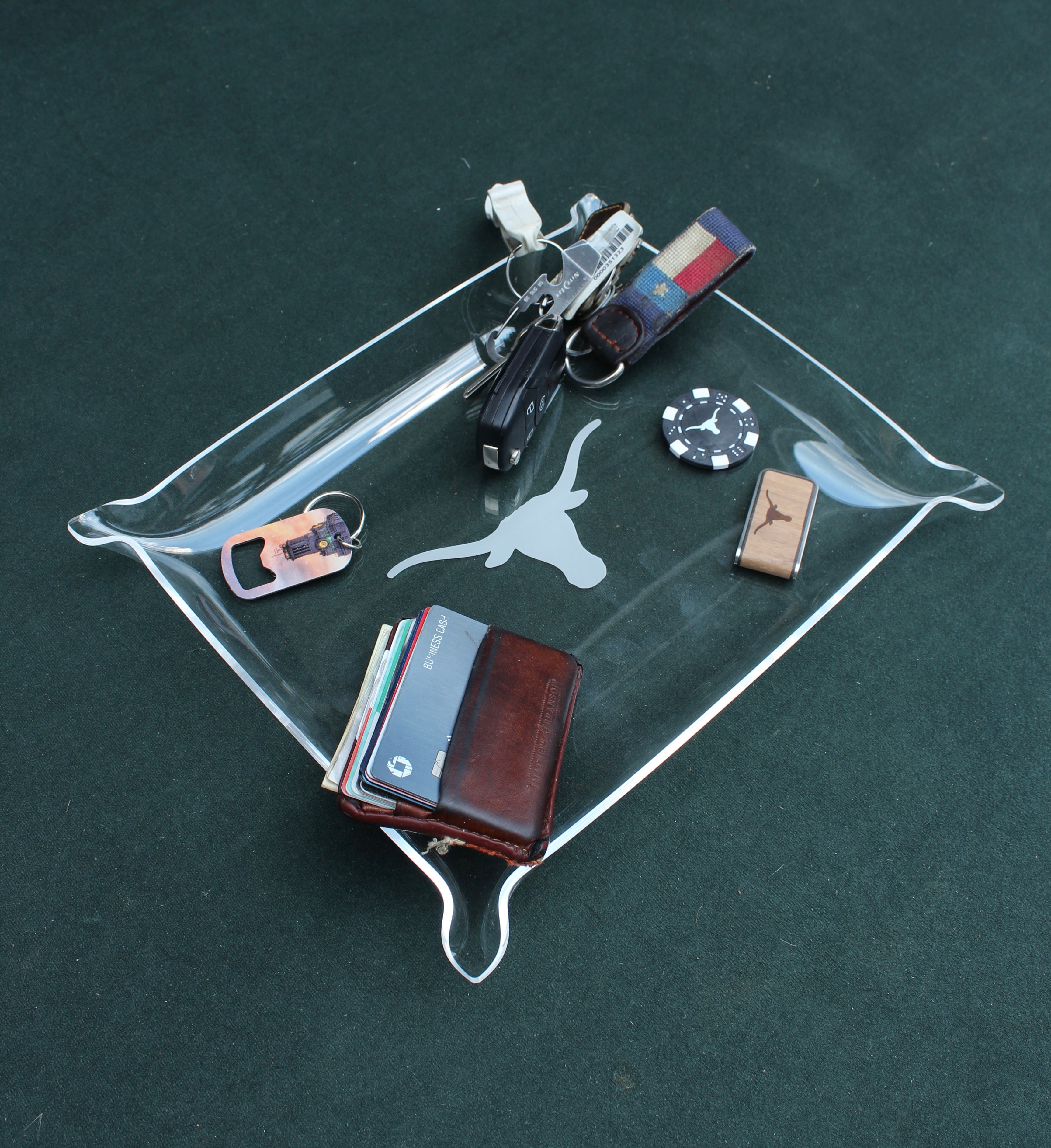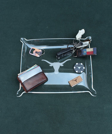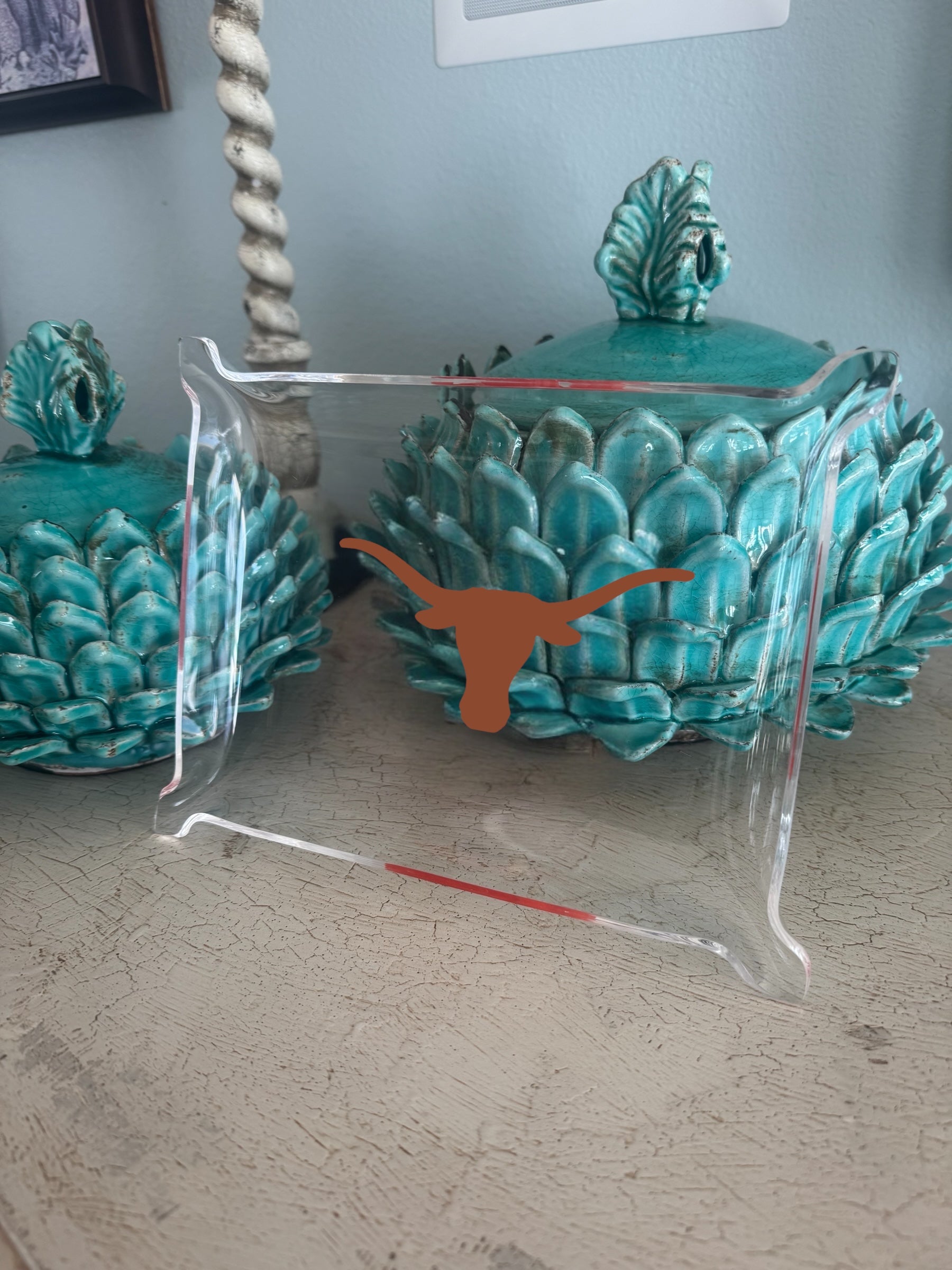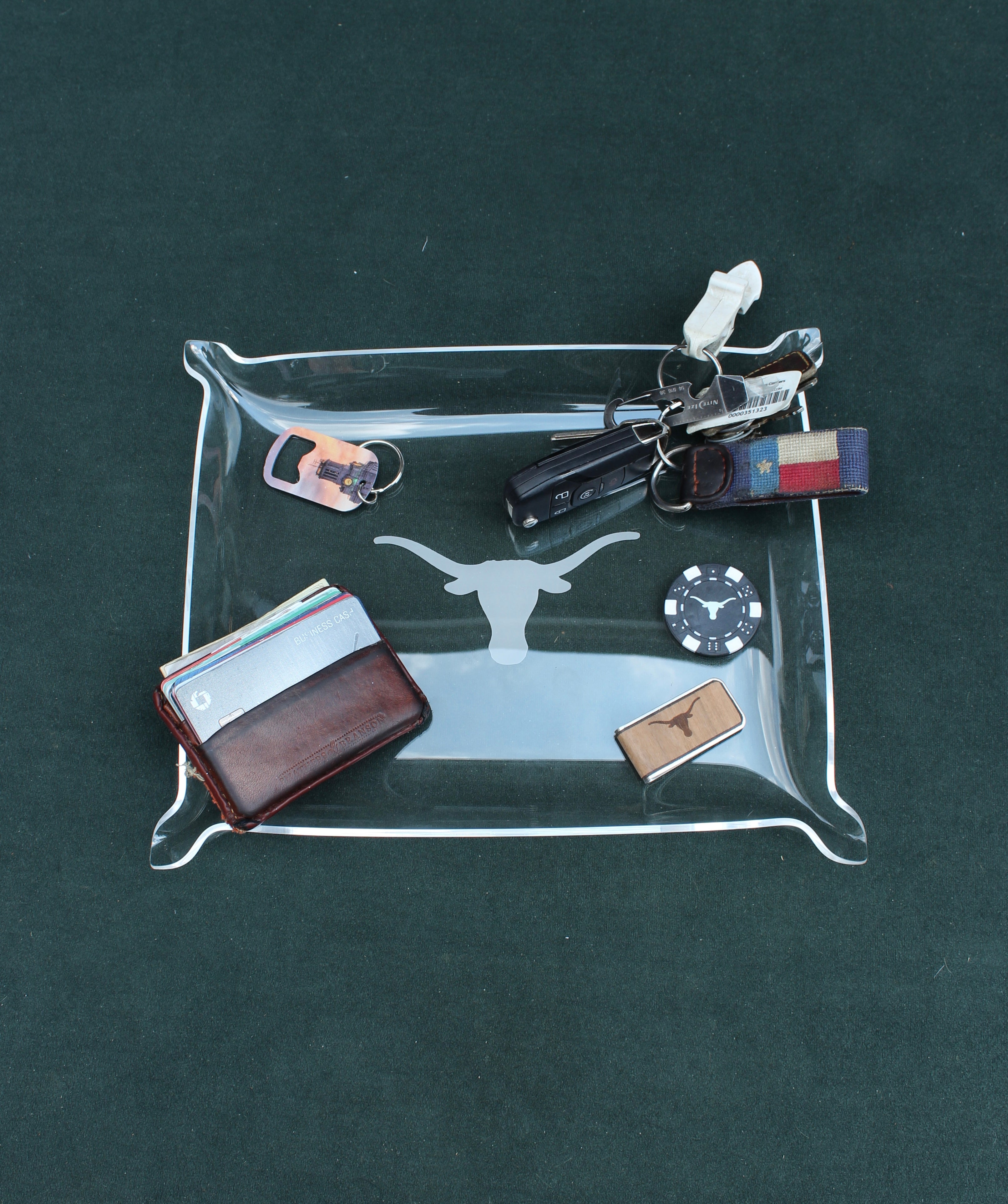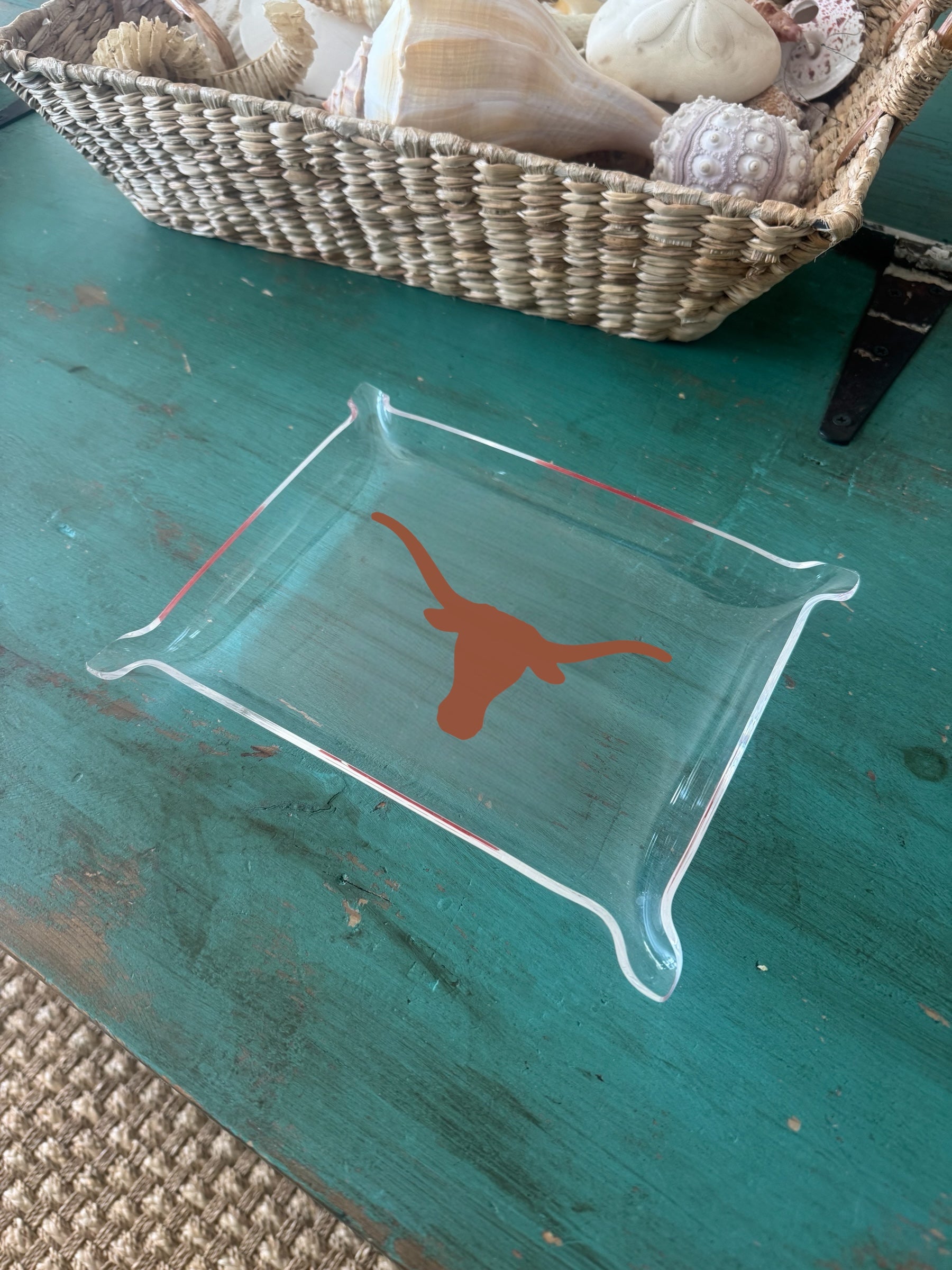 Show off your Texas pride with this sleek and sturdy acrylic tray, featuring the iconic UT Longhorn logo. Measuring 4.5” x 6”, it’s the perfect size for organizing essentials on a desk, bar cart, coffee table, or countertop. Whether you're gifting a fellow fan or adding a touch of burnt orange to your own space, this tray brings modern style and Longhorn spirit to any setting.