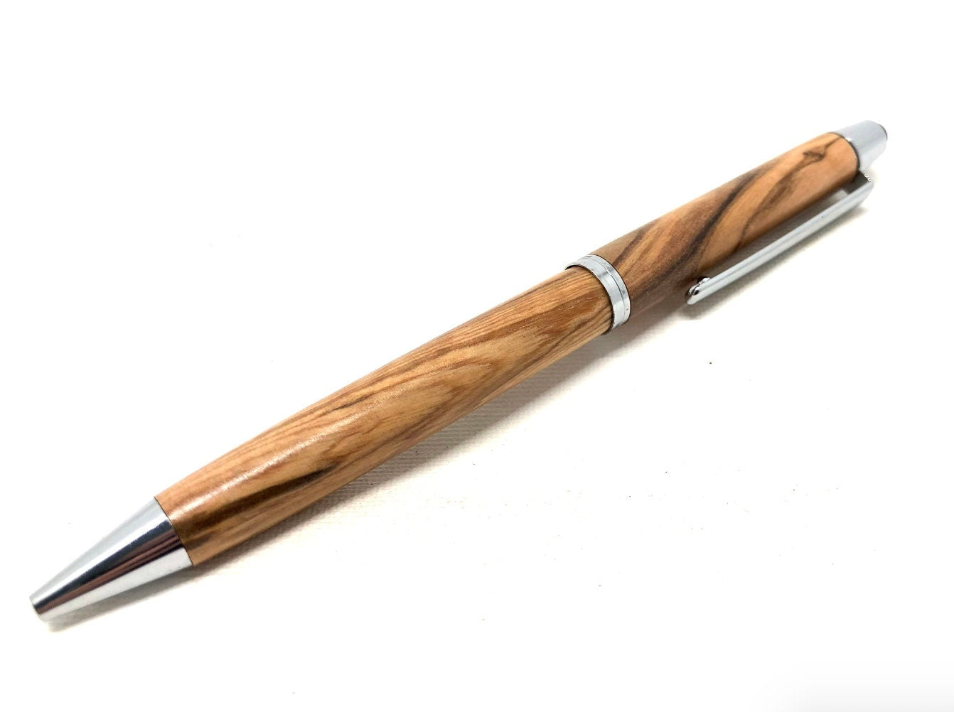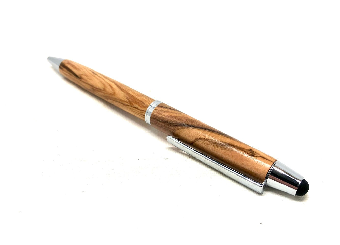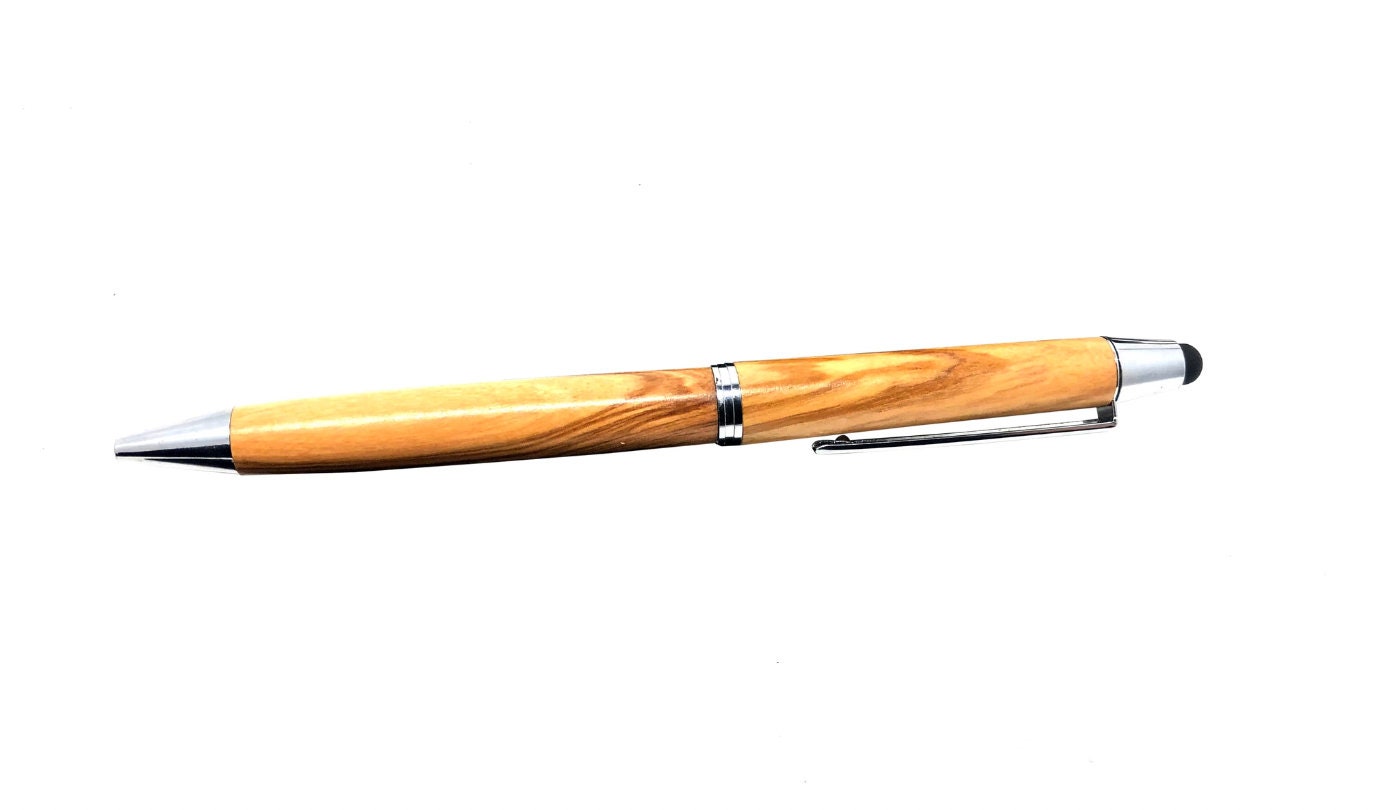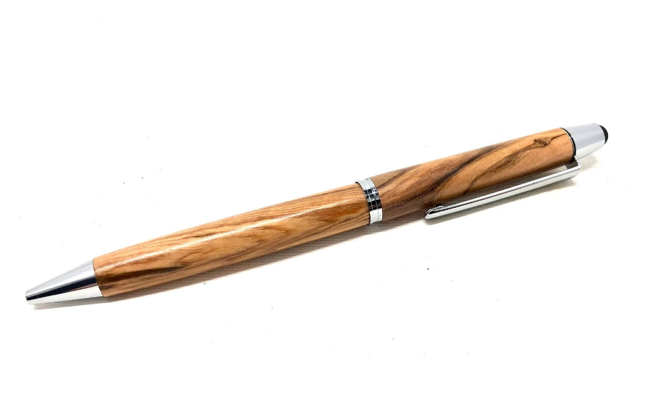 Italian olive wood ballpoint pen including touch pen. The wood is obtained from ancient trees, which are replaced selectively by new plantings.