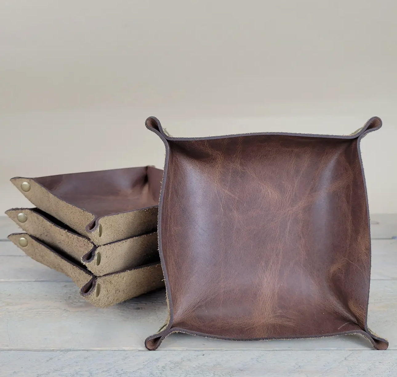 • Materials: Full-grain leather + antiqued brass rivets