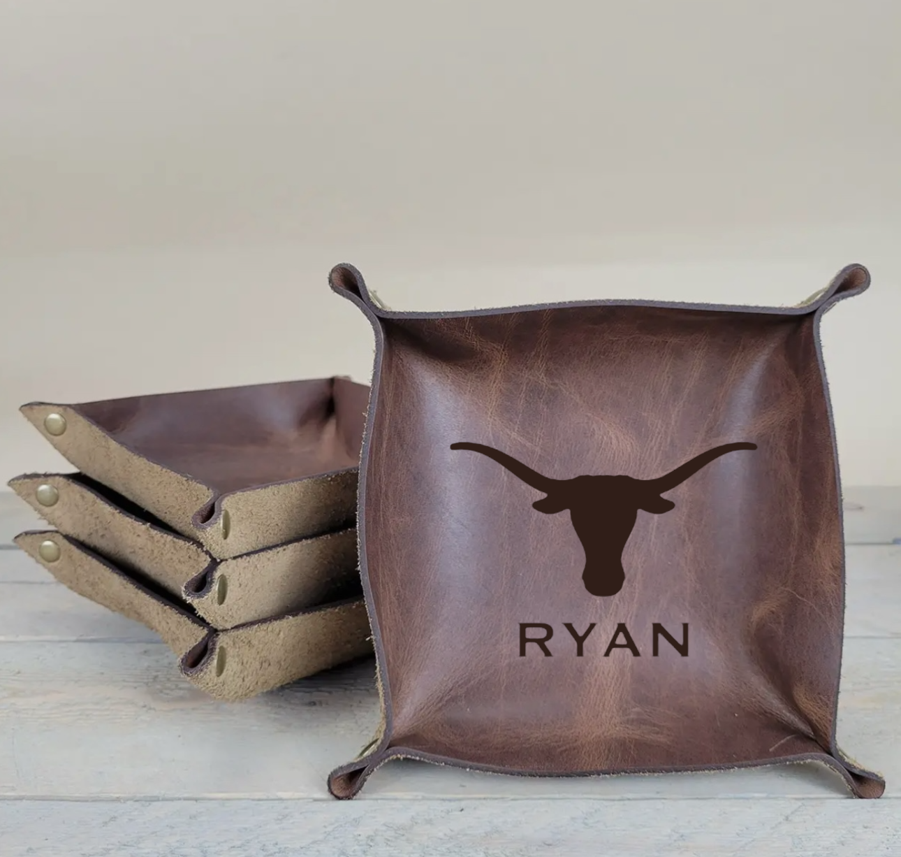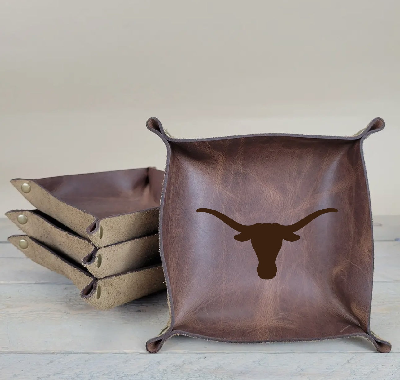 Looking for a practical gift with Longhorn flair? These handcrafted leather catchalls are perfect for holding keys, coins, wallets, or jewelry — whether it’s by the front door, bedside, or desk. Made from full-grain leather and finished with antiqued brass rivets, each tray features the iconic UT Longhorn logo or can be left blank for a minimalist look. Durable, stylish, and functional — it’s a staple every Texas fan needs.